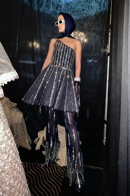 Embellished Silk Organza Sheer Black Mini Dress with Body Suit