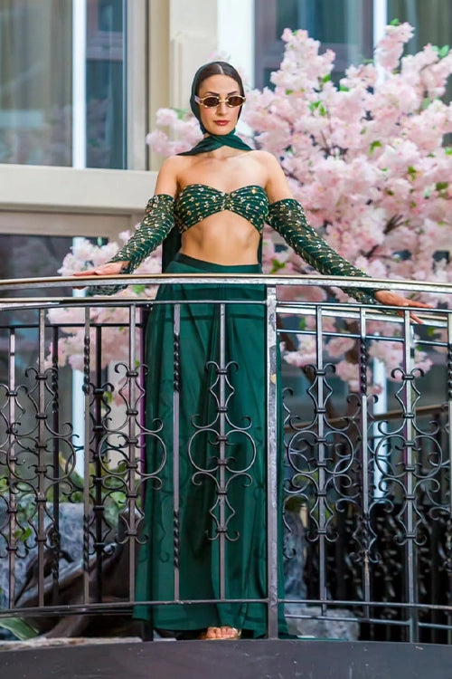 Red Feather Crop Top and Embellished Skirt with High Slit Set