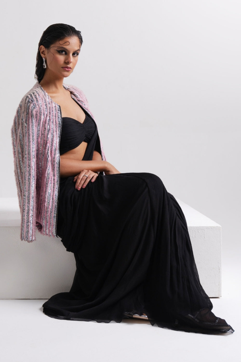 This statement sequin-worked jacket is a perfect blend of shimmer and sophistication. Crafted with intricate vertical sequin detailing, it features a soft interplay of blush, rose, and subtle metallic tones that catch the light beautifully.