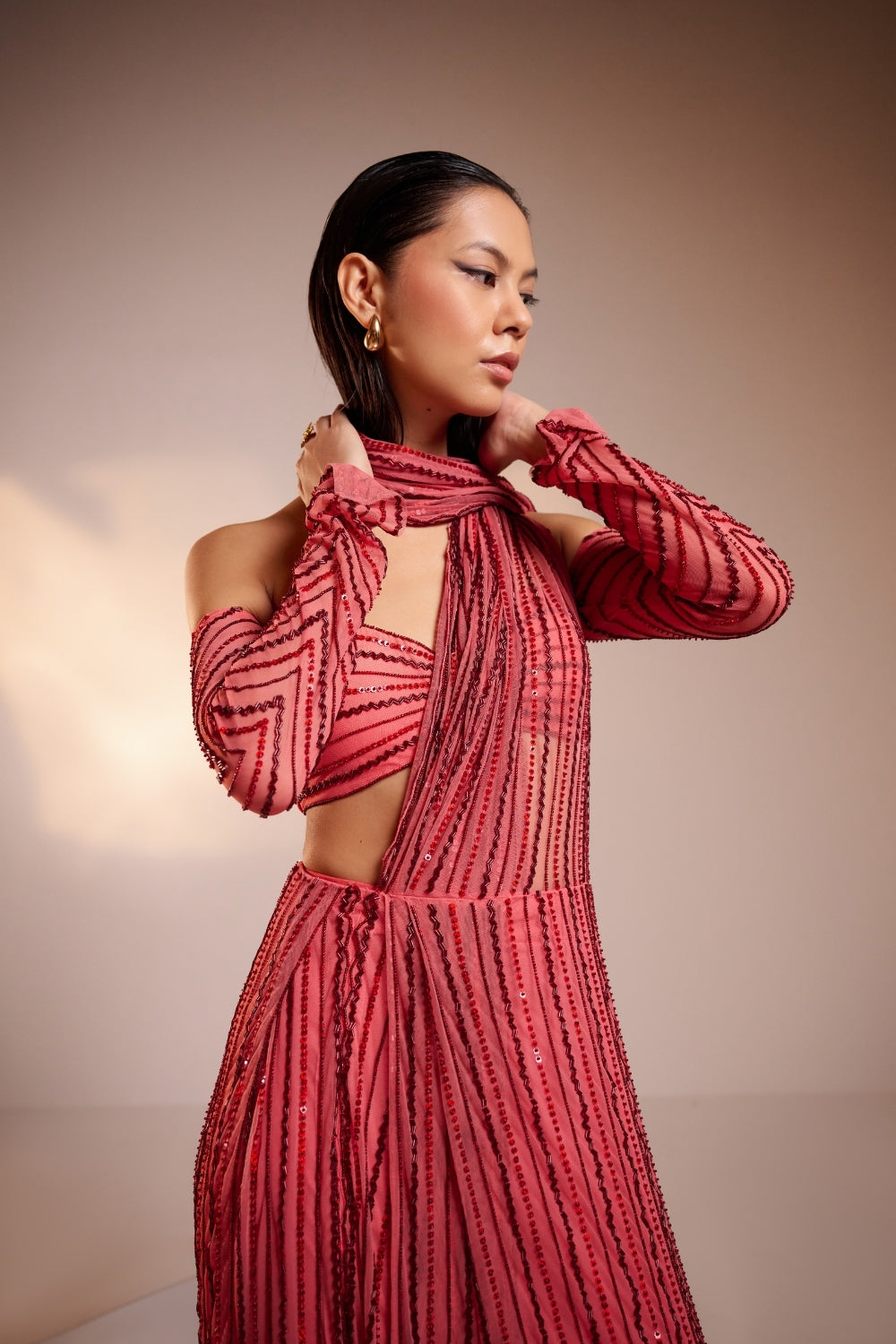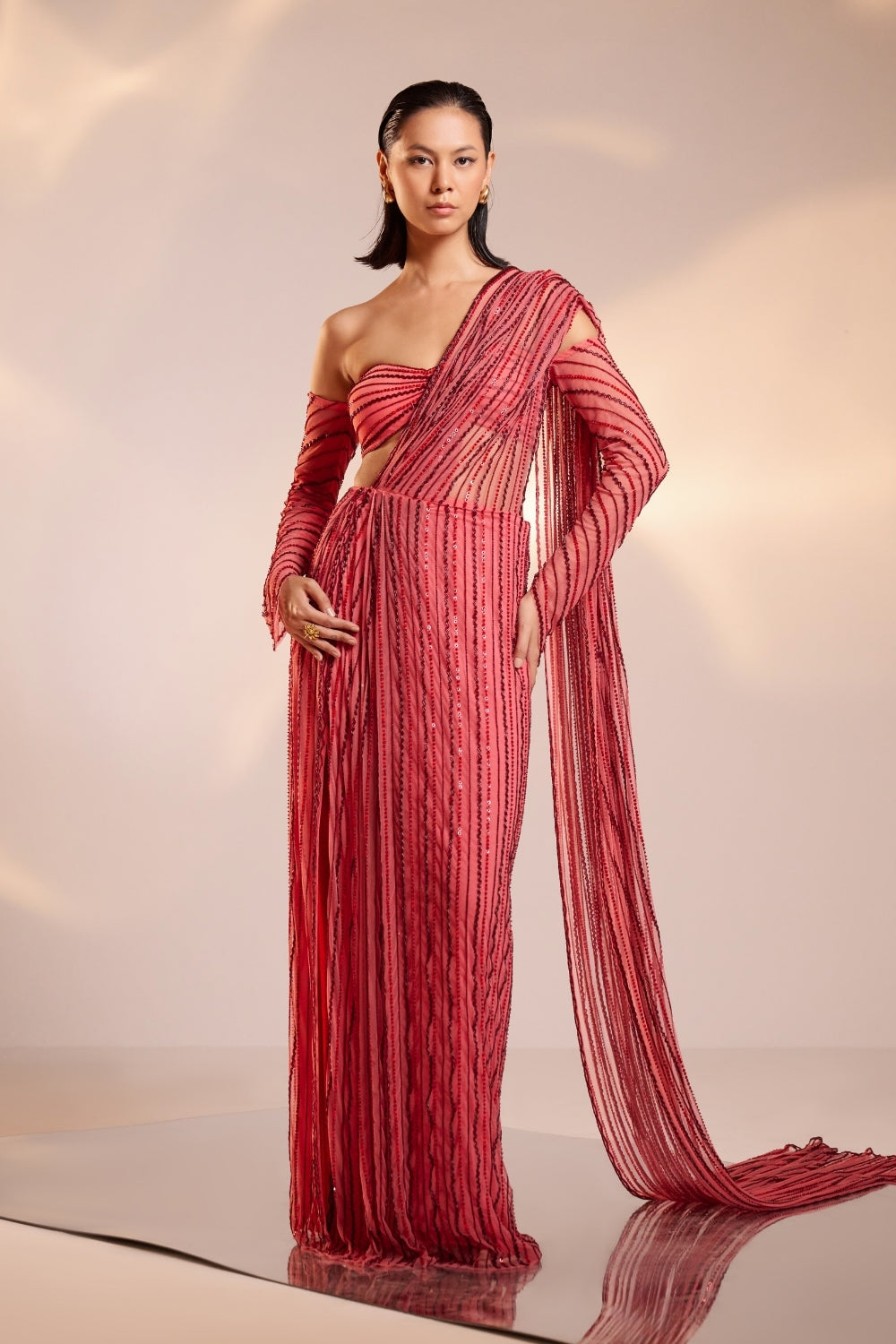 Fuchsia Pink Hand-Embellished Draped Saree Set