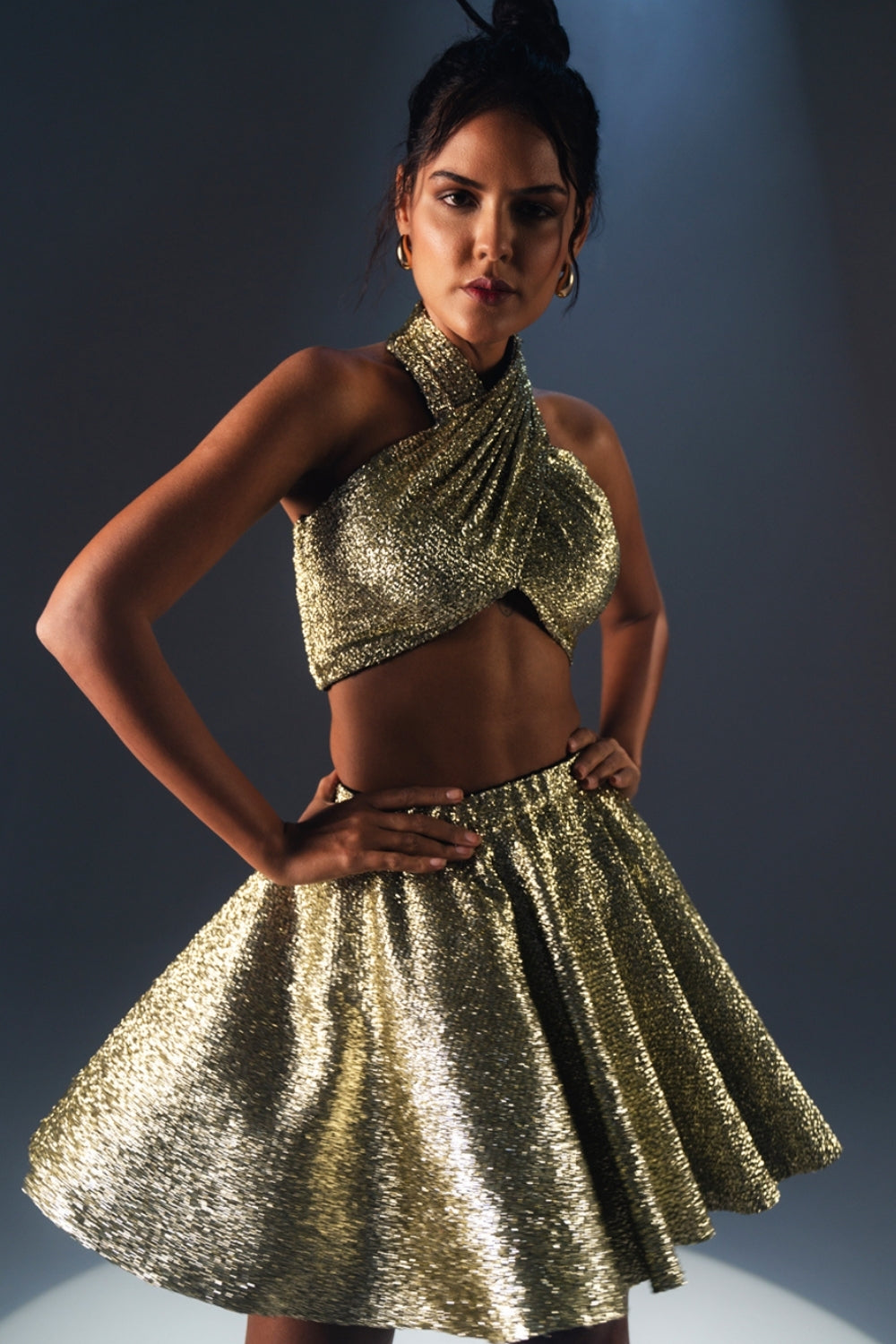 Step into the spotlight with this dazzling metallic gold two-piece set. Featuring a bold criss-cross halter-style crop top, this outfit adds an edgy yet glamorous touch to your eveningwear. The matching flared skirt complements the top perfectly, creating a balanced silhouette that shimmers with every move. Made from a textured metallic fabric, this set is ideal for parties, red carpet events, or any occasion where you want to turn heads. Embrace luxury and modern sophistication with this statement-making ensemble.