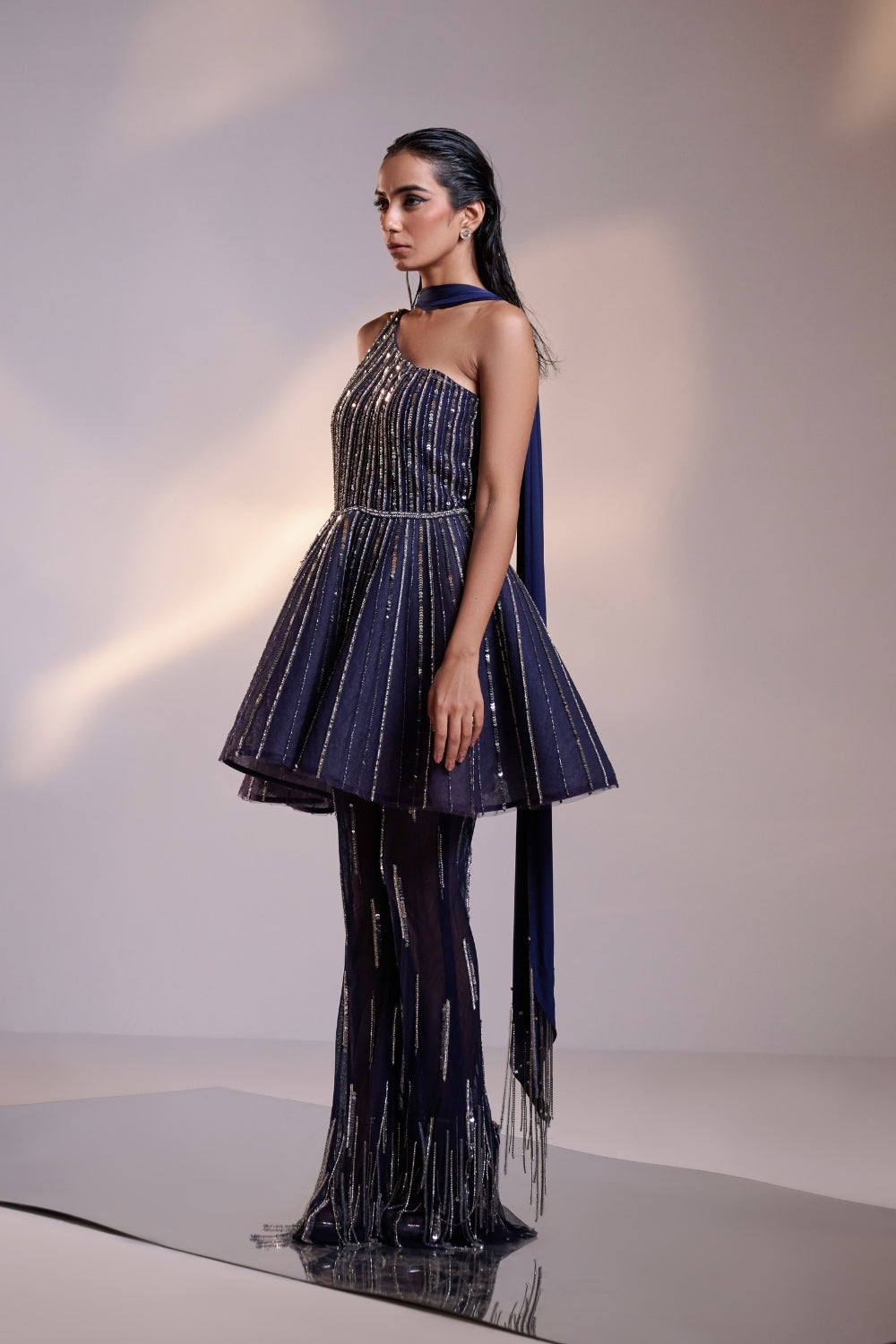 Turn heads with this Midnight Blue Hand-Embellished Co-ord Set, featuring a sculpted corset-style top richly adorned with shimmering beadwork and sequins. The structured peplum silhouette adds a dramatic flair, beautifully balanced by the sleek, straight-fall trousers with embellished cascading panels.