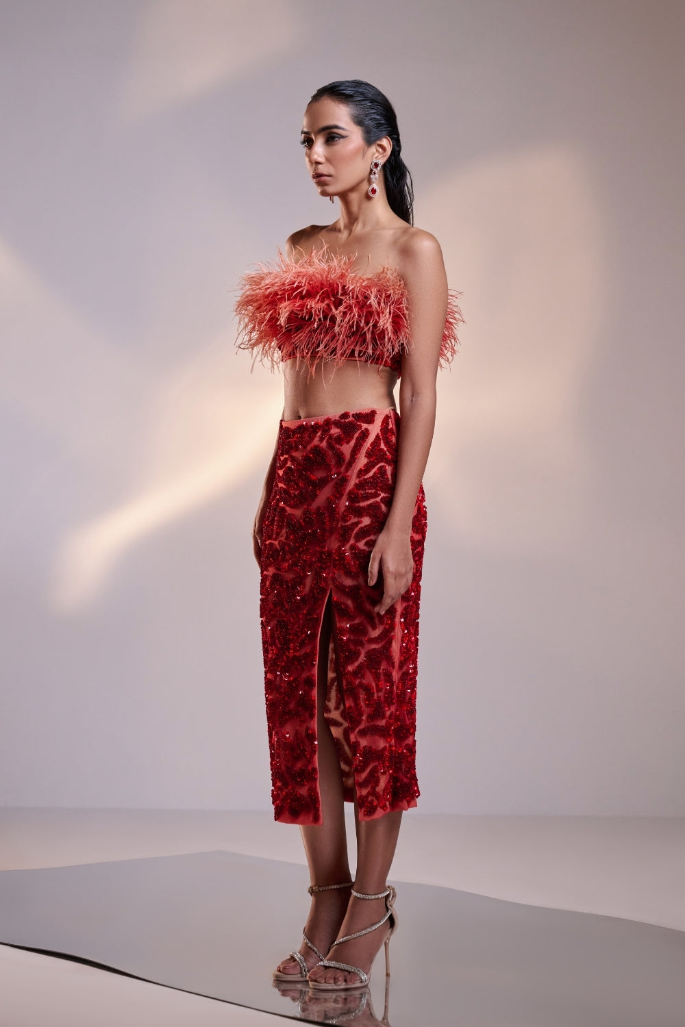 Make a bold statement with this stunning two-piece ensemble. The strapless crop top, adorned with delicate red feathers, brings a sense of playful elegance, while the fitted embroidered skirt showcases a striking pattern. The skirt features a daring thigh-high slit, adding a touch of sultry sophistication. Perfect for special occasions, this set offers a chic blend of texture and style, accentuating confidence and grace. Paired with subtle accessories and heels, this look is sure to turn heads.
