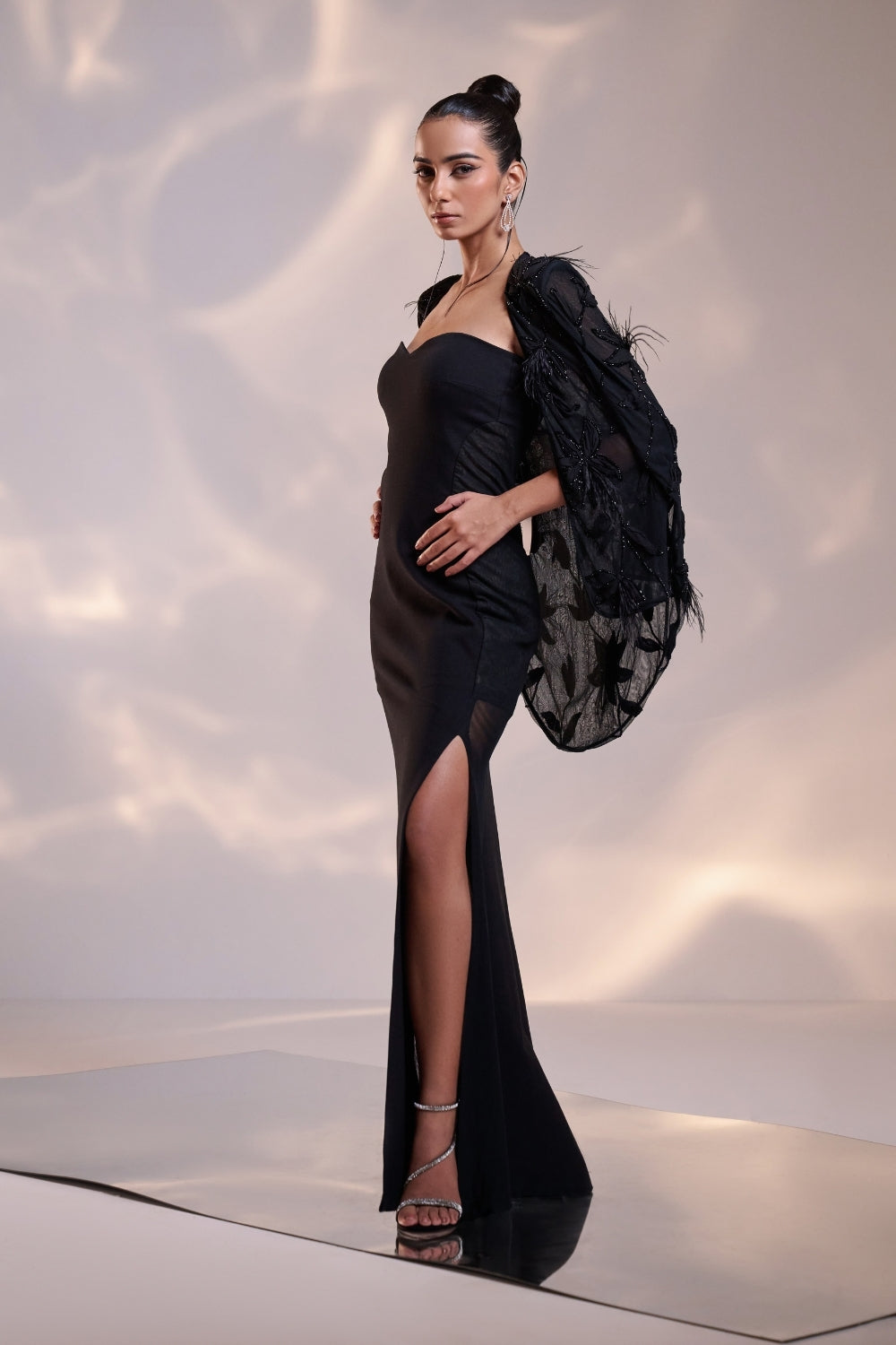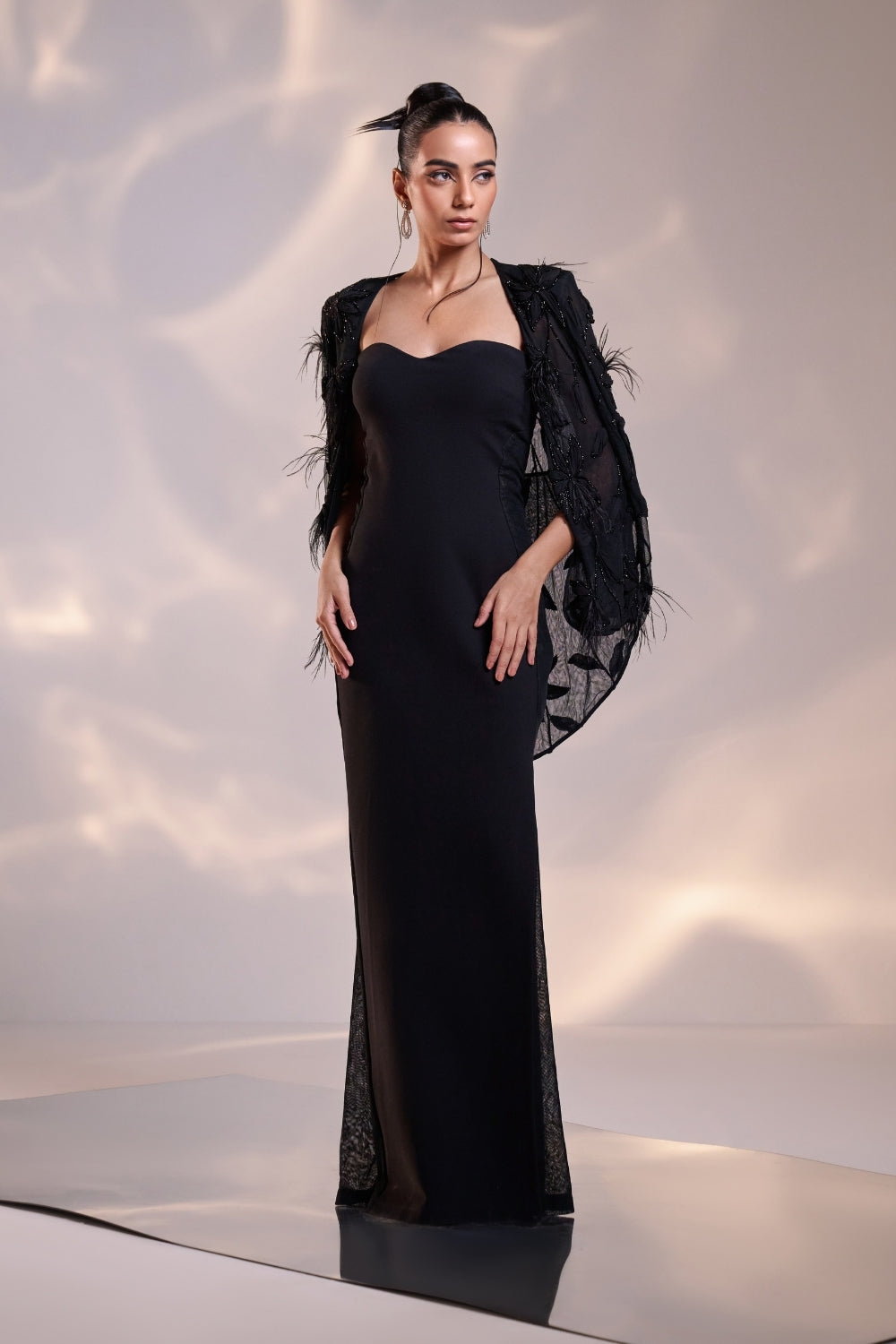 This striking black evening gown features a structured sweetheart bustier that accentuates the neckline and creates a refined, feminine silhouette. The gown falls gracefully into a smooth, body-skimming form, offering timeless elegance. Paired with a dramatic sheer jacket embellished with soft feathered or textured appliqué detailing, the look is elevated with bold sophistication. The jacket adds volume, artistry, and contemporary flair, making the ensemble perfect for high-fashion events, cocktail evenings, or luxury soirées. Together, the pairing delivers a powerful blend of classic couture and avant-garde styling.